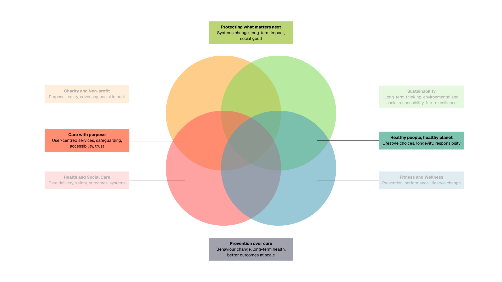 We didn't choose these four sectors because they look good on a slide. We chose them because they share challenges, values, and opportunities. Because insight travels between them and work done well in one can unlock progress in another. And because the organisations within them are trying, in different ways, to make life better for people and for the planet. The diagram is simply a reflection of that belief.